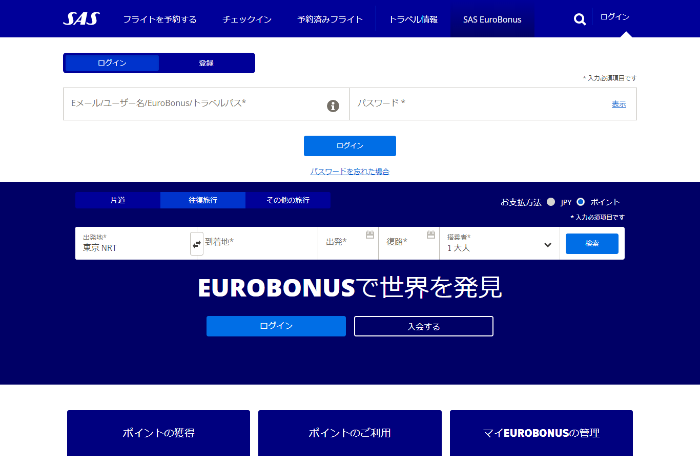 スカンジナビア航空マイルページ