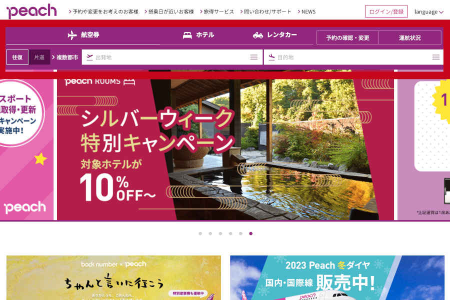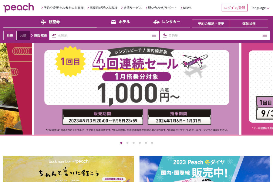 まずはピーチの公式ウェブサイトにアクセスします。トップページには開催中のセールのバナーがあるのでクリックしてみると、いま最安の航空券がわかります。