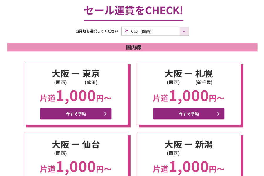 セール情報ページに飛びました。片道1,000円からのセール運賃で販売されている、大阪/関西〜新潟線を予約してみたいと思います。「今すぐ予約」をクリックします。