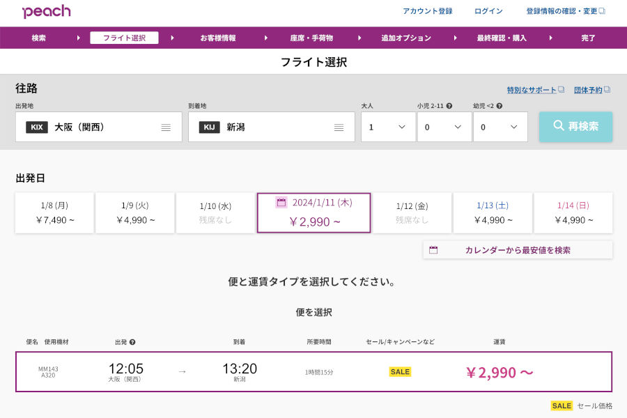 検索時点ではセール開始から時間が経っていたため、1,000円の最安航空券は売り切れていましたが、2,990円の日程を見つけることができました。往復ともに最も安い運賃タイプである「シンプルピーチ」を選択して次のページに進みます。