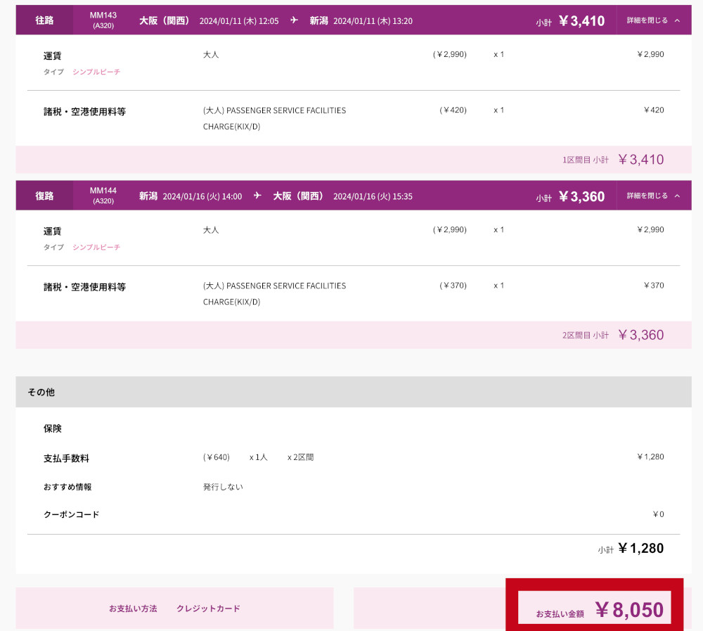 決済画面です。諸税・空港使用料等のほか、クレジットカード支払いの場合、支払い手数料が1区間につき640円が追加され、最終金額は8,050円となりました。