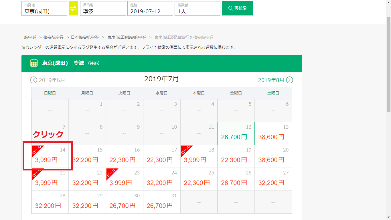セール情報ページに飛ぶので、セールの具体的な詳細を確認します。今回は3,999円からのセール運賃で販売されている東京/成田〜中国/寧波線を予約してみます。