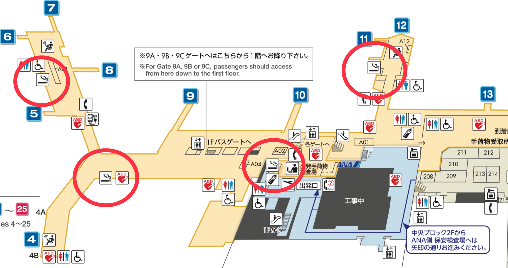保安検査後、制限エリアの喫煙所は、搭乗待合室8番付近に1か所、9番ゲートの手前に1か所、10番ゲート付近に1か所、11番ゲート付近に1か所あります。