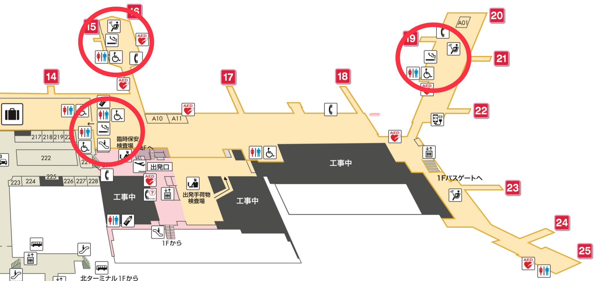 保安検査後、制限エリアの喫煙所は、搭乗待合室15番付近に1か所、14番ゲートの手前に1か所、19番ゲート付近に1か所あります。