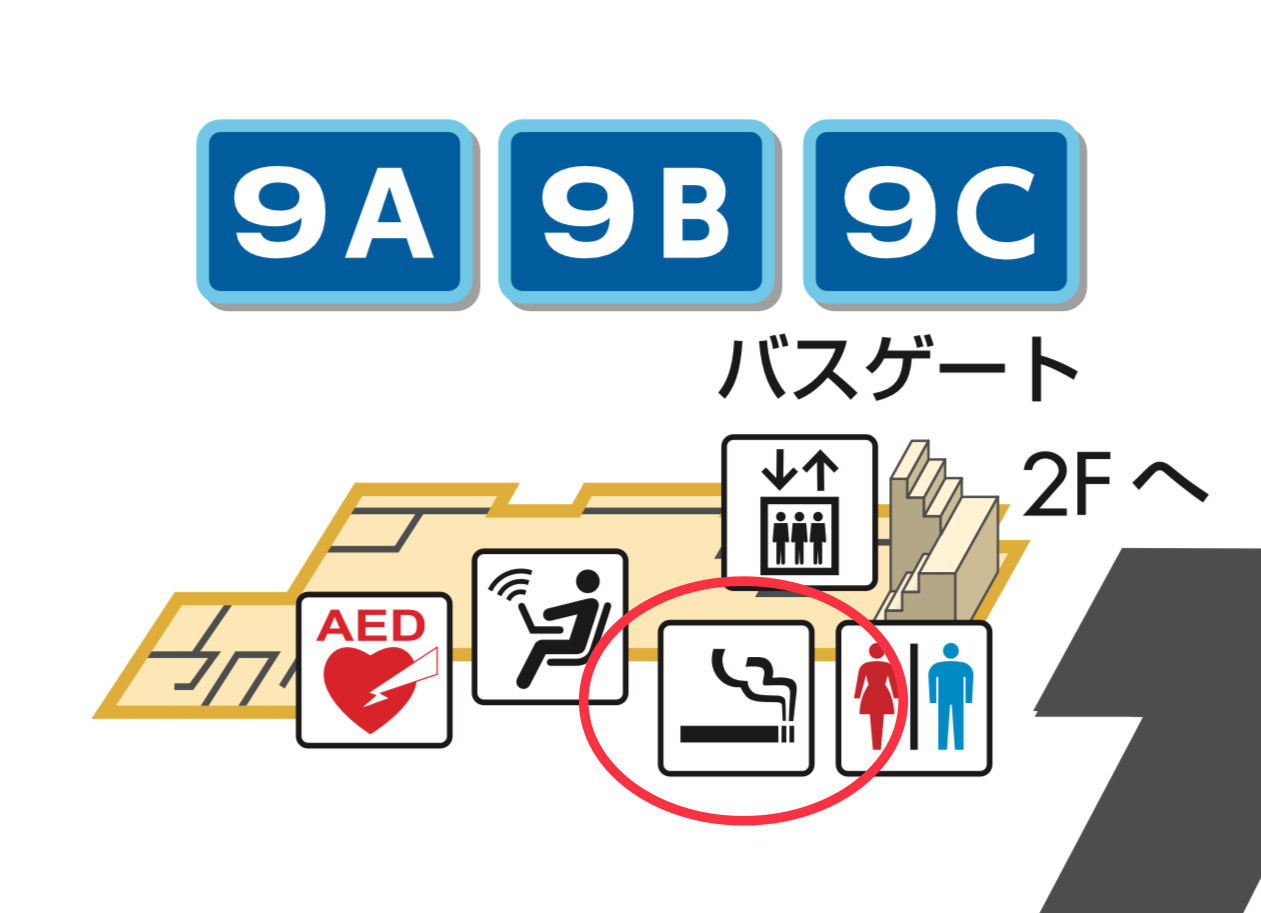 保安検査後の2階国際線の制限エリアには9か所の喫煙所があります。