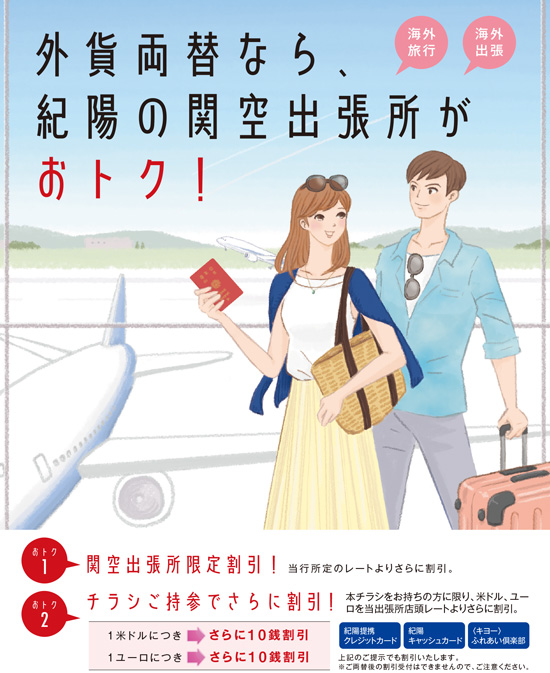 割引券は紀陽銀行のウェブサイトから入手できます。外貨両替ページに遷移して、紀陽銀行の窓口前にいる担当者に見せましょう。
