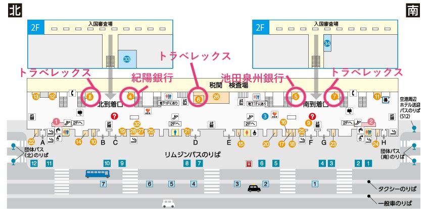 関空の第1ターミナルビル1階〈国際線到着フロア〉には、「紀陽銀行」、「池田泉州銀行」、「トラべレックス〈国際線到着ロビー南店・国際線到着ロビー北店・国際線到着ロビー店〉」があります。