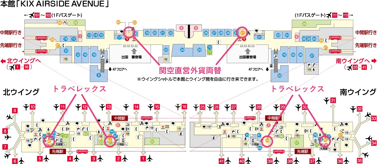 関西国際空港(関空)の第1ターミナルビル〈国際線ゲートエリア〉には、「関空直営外貨両替ショップ〈出国エリア北店・出国エリア南店〉」、「トラべレックス〈北ウイング先端駅店・北ウイング中間駅店・南ウイング中間駅店・南ウイング先端駅店〉」があります。