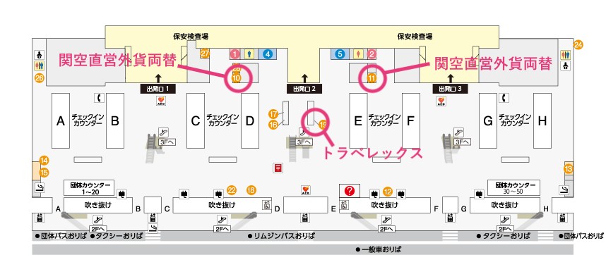 関西国際空港の両替所は、第1ターミナルの一般エリア(1階~4階)に12か所、出国審査通過後の制限エリアに6ヶ所あります。外貨自動両替機は第1ターミナル1階に2台あります。