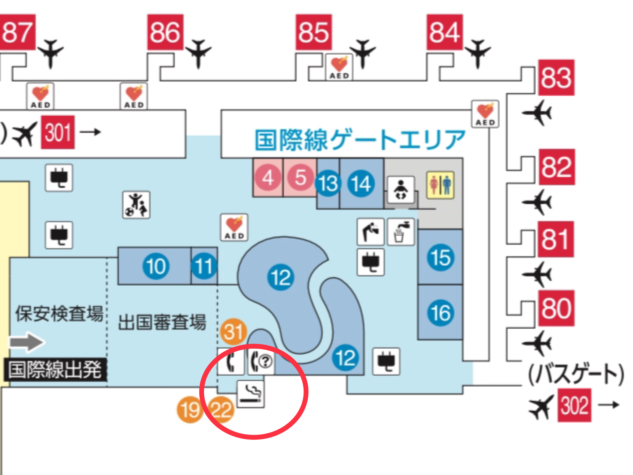 保安検査後、国際線制限エリア北ウイングの喫煙所は、搭乗待合室11番ゲート付近に1か所、14番ゲート付近に1か所あります。
