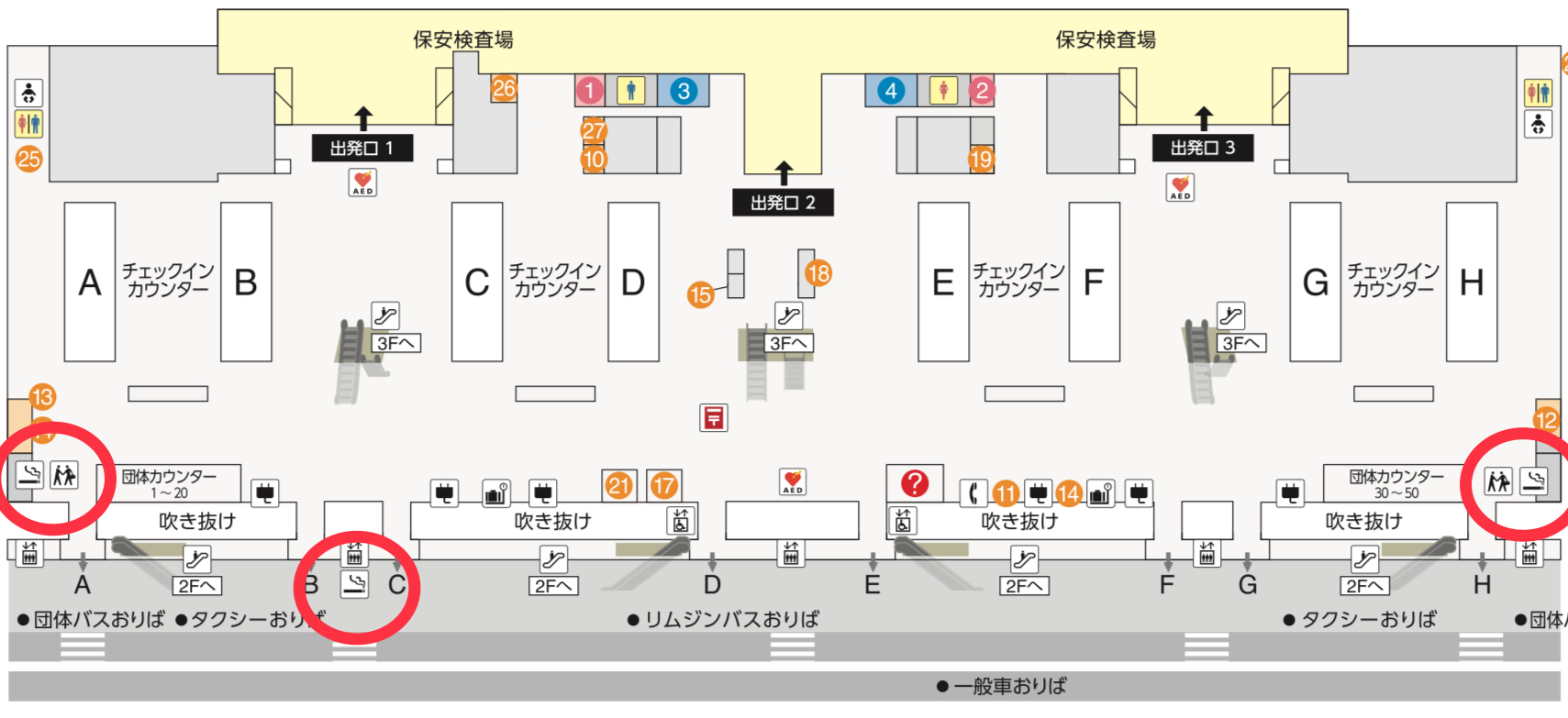 Aチェックインカウンター付近に1か所、B出口付近に1か所、Hカウンター付近に1か所喫煙所があります。