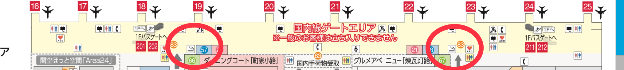 保安検査後、国内線制限エリアの喫煙所は、搭乗待合室19番ゲート付近に1か所、23番ゲート付近に1か所あります。