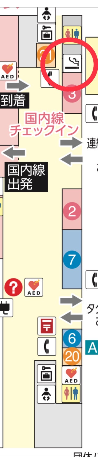 2階国内線出発・到着フロアには1か所の喫煙所があります。