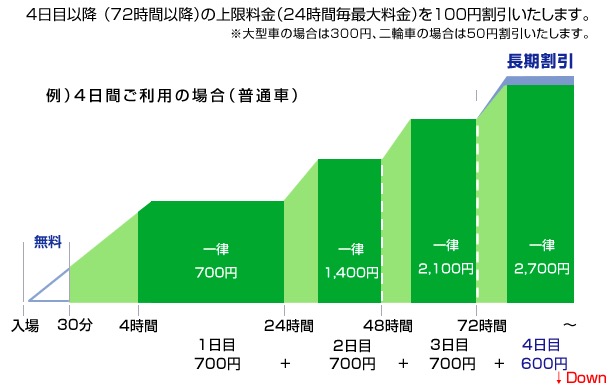駐車場を4日間以上利用する場合、長期割引サービスとして割引価格が適用されます。普通車の場合、4日目以降の24時間毎の最大料金が700円から600円に100円割引されます。