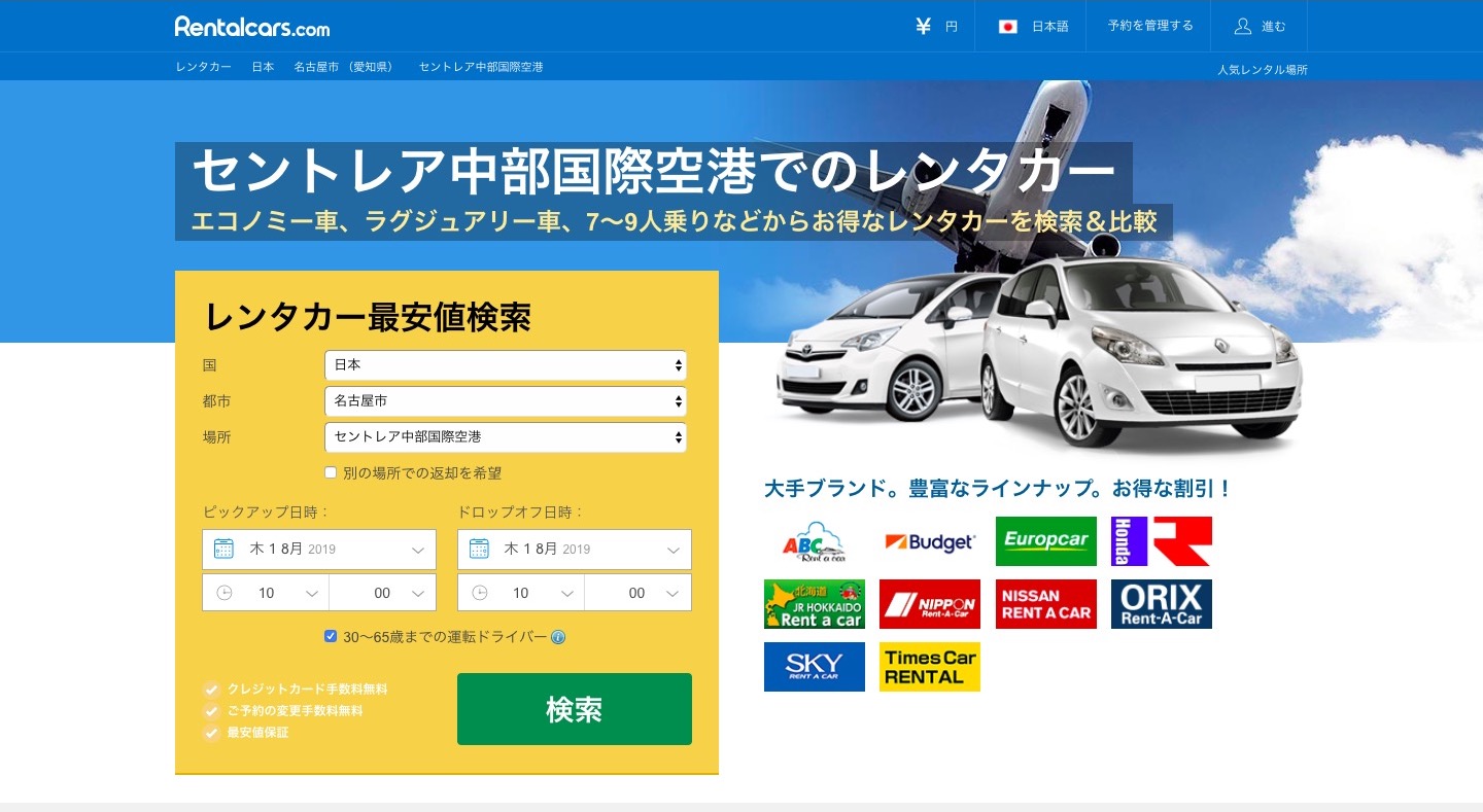中部国際空港 レンタカー予約 Rentalcars.com Webサイト