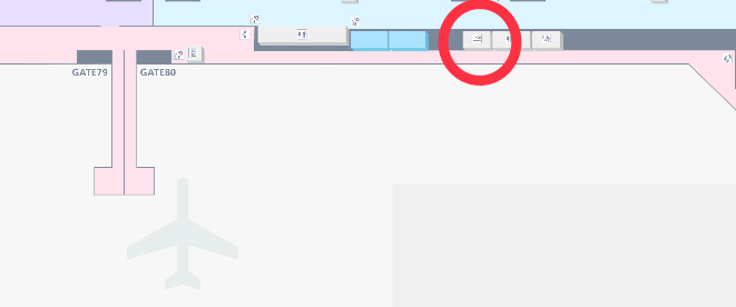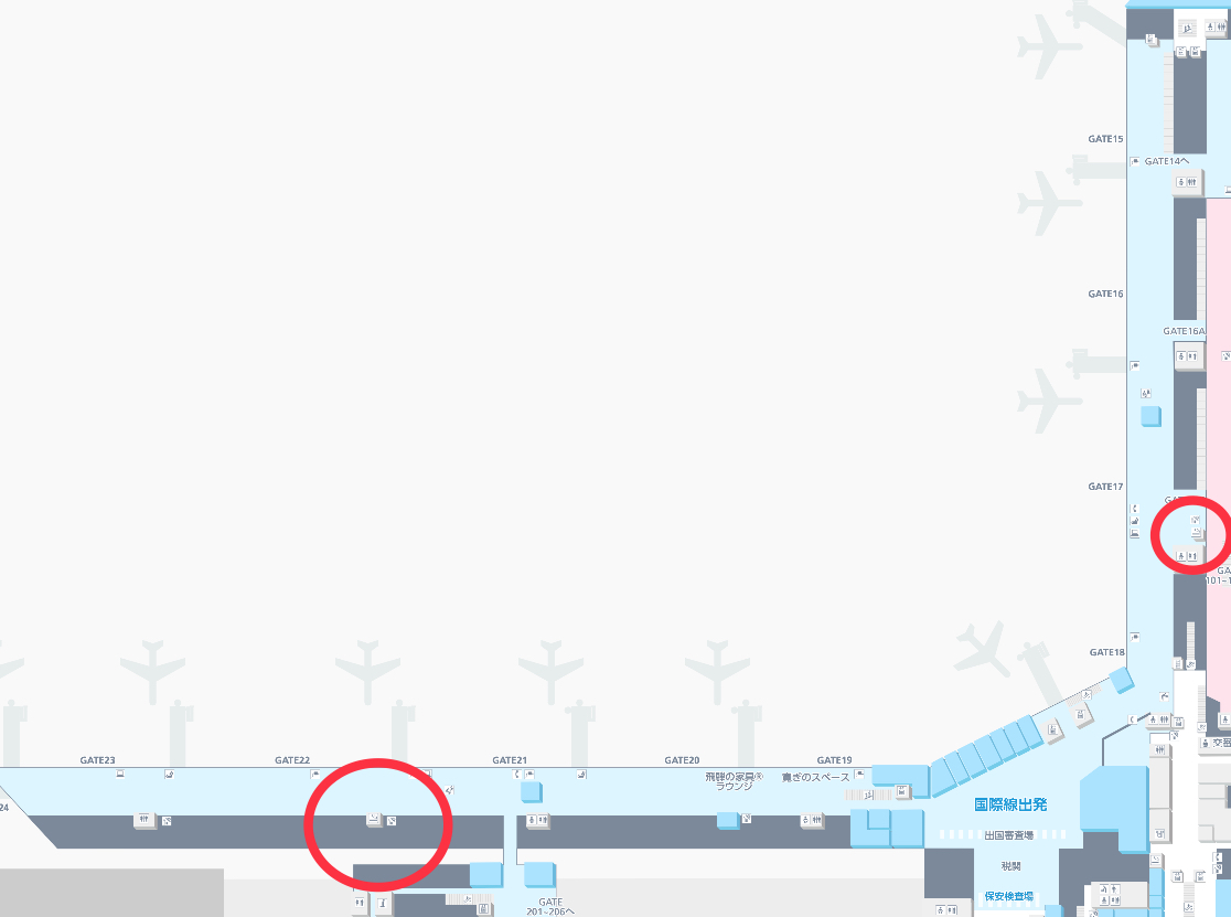 保安検査後、国際線制限エリアの喫煙所は、22番ゲート手前に1か所、17Aゲート付近に1か所あります。