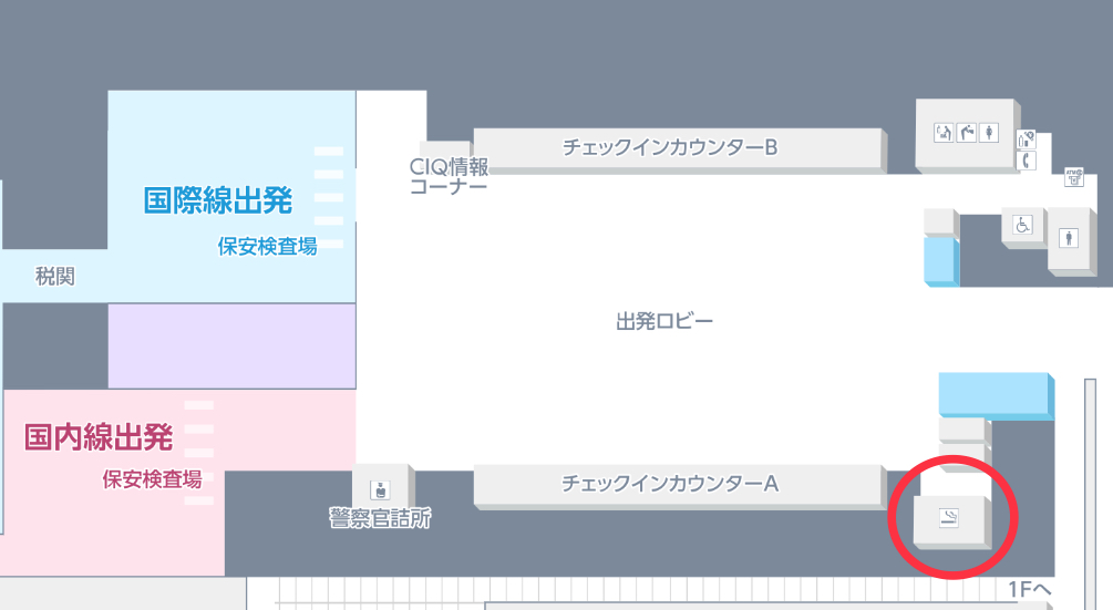 チェックインカウンターA付近に1か所喫煙所があります。