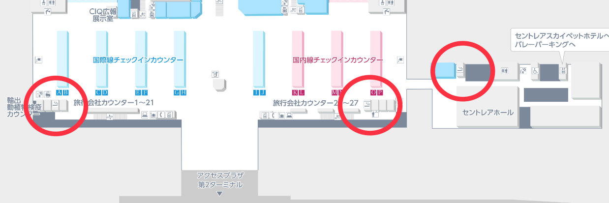 Aチェックインカウンター付近に1か所、Oチェックインカウンター付近に1か所、セントレアホール手前に1か所喫煙所があります。