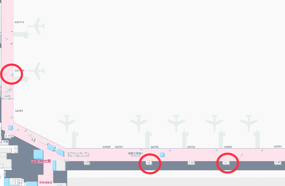 保安検査後、国内線制限エリアの喫煙所は、10番ゲート付近に1か所、6番ゲート付近に1か所、4番ゲート付近に1か所あります。