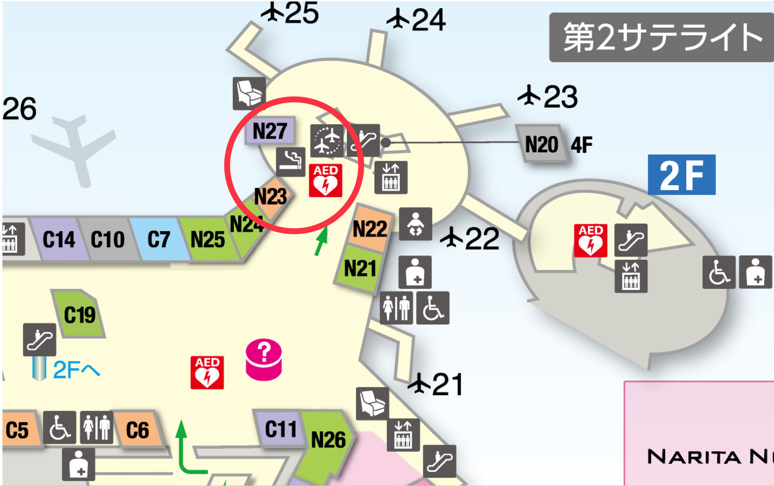 保安検査後、国際線制限エリア第2サテライトの喫煙所は、搭乗待合室25番ゲート付近に1か所あります。
