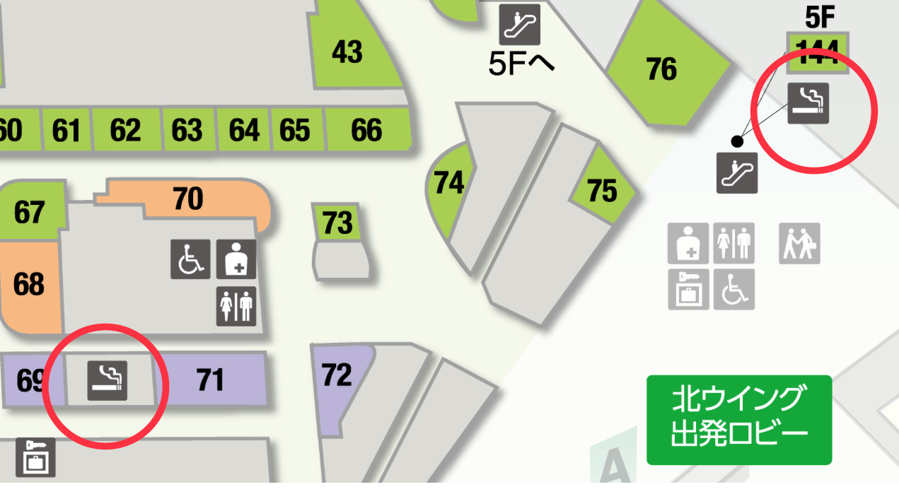 4階国際線出発ロビー北ウイングの喫煙所は、北口N1付近に1か所、北口N4付近に1か所あります。