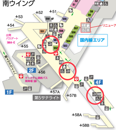 保安検査後、国内線制限エリアの喫煙所は、搭乗待合室55番・56番ゲート付近に1か所、57番ゲートの手前に1か所、57番・58番ゲート付近に1か所あります。