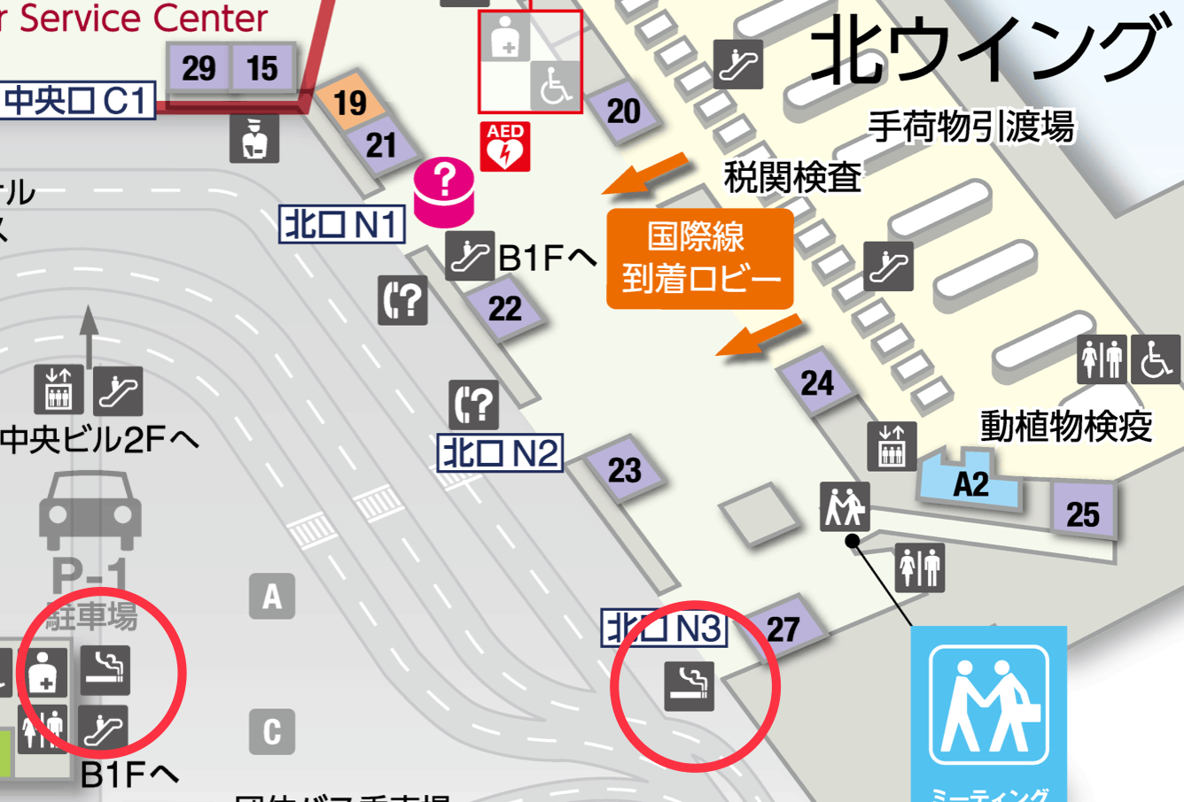 国際線到着ロビー北ウイングの喫煙所は、北口N3付近に1か所、第1駐車場に1か所あります。