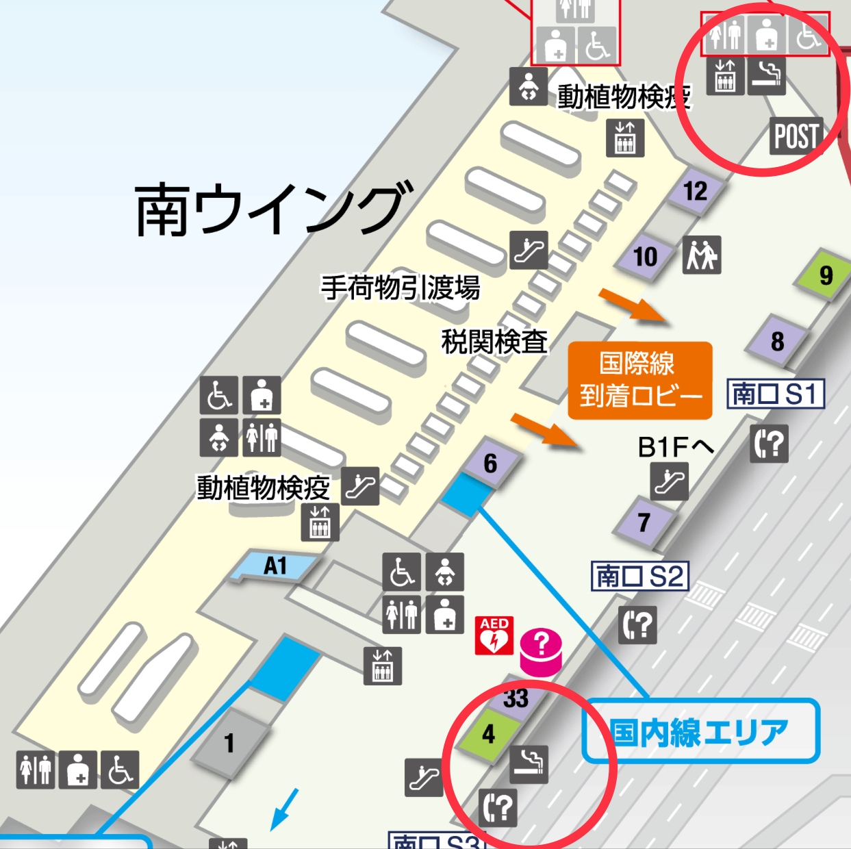 国際線到着ロビー南ウイングの喫煙所は、南出口S3に1か所、国際線到着ロビー付近に1か所あります。