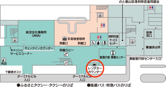 能登空港には、レンタカーカウンターが旅客ターミナル1階到着ロビーに設置されており、手続きなどはここで行います。