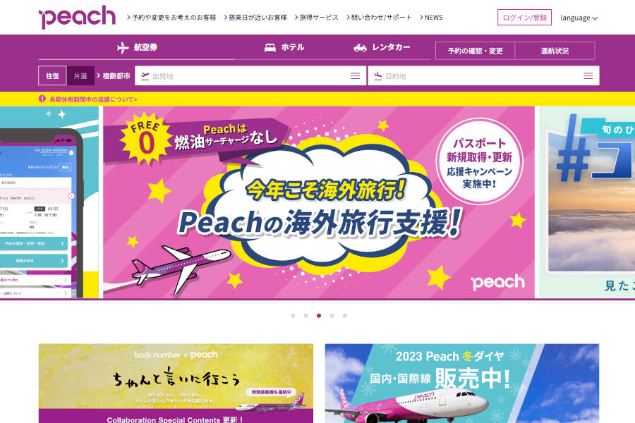 ピーチ(Peach)の欠航や遅延などの運航状況は、国際線・国内線の両方ともこちらから確認できます。