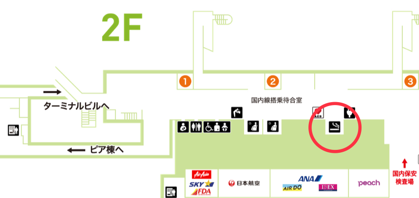 保安検査後、国内線制限エリアの喫煙所は、搭乗待合室2番ゲート付近に1か所あります。