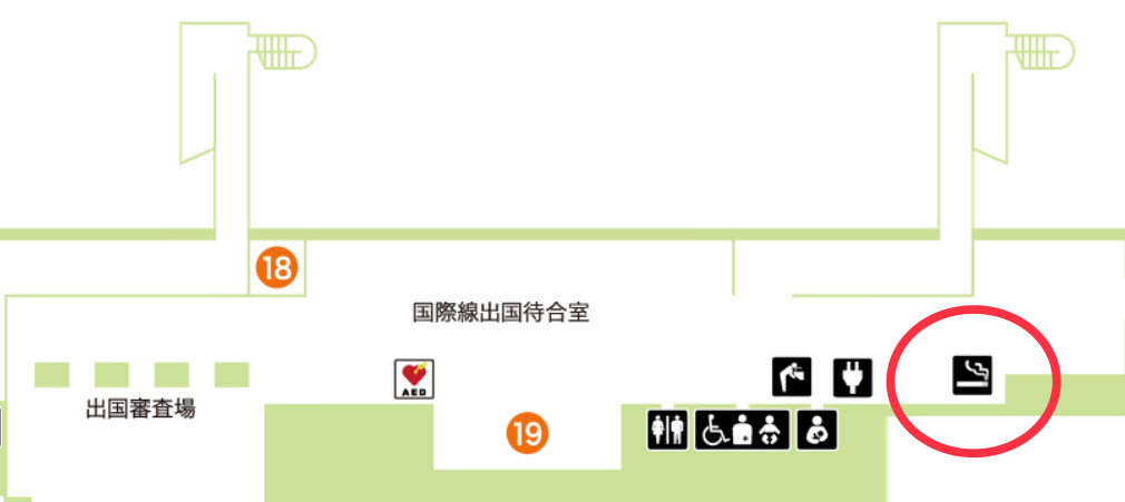 保安検査後、国際線制限エリアの喫煙所は、搭乗待合室右側に1か所あります。